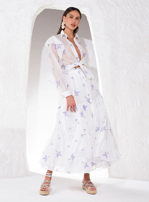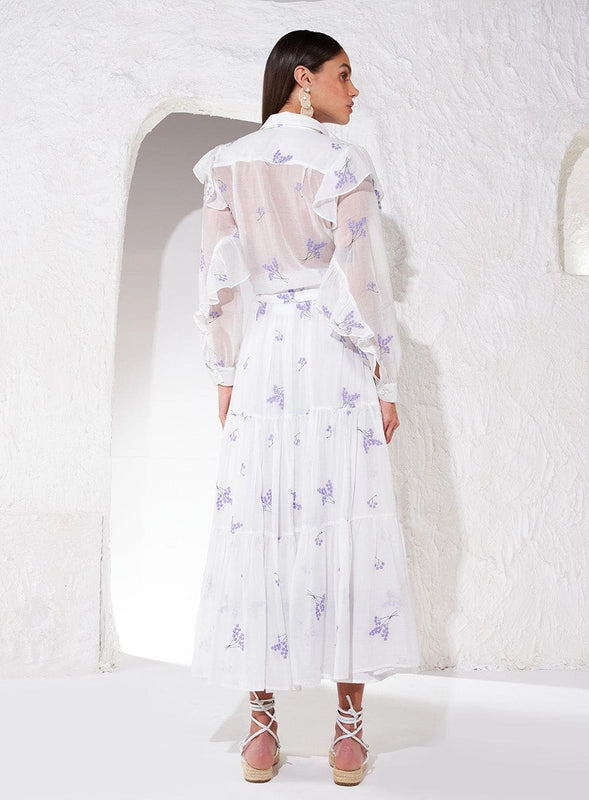 Camisa ML Com Flores Bordada Em Lilás e Babado Skazi