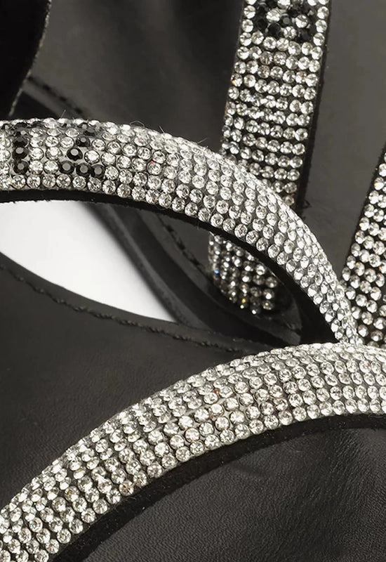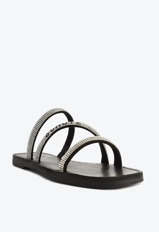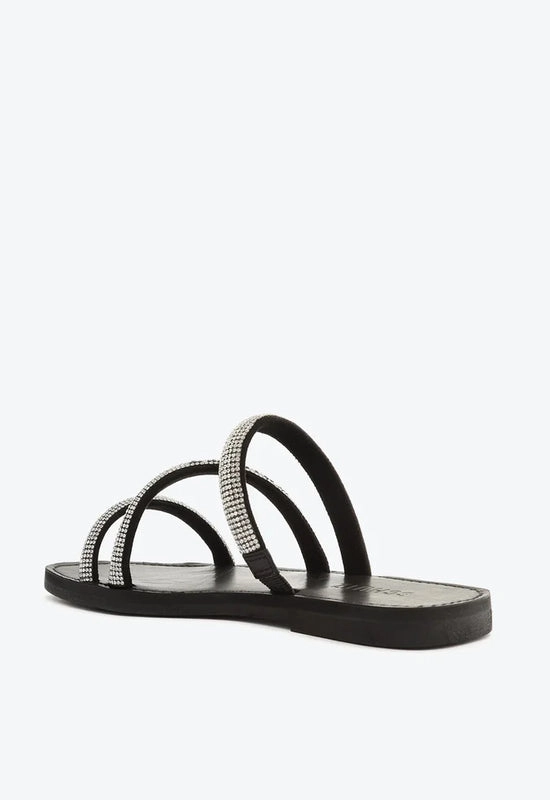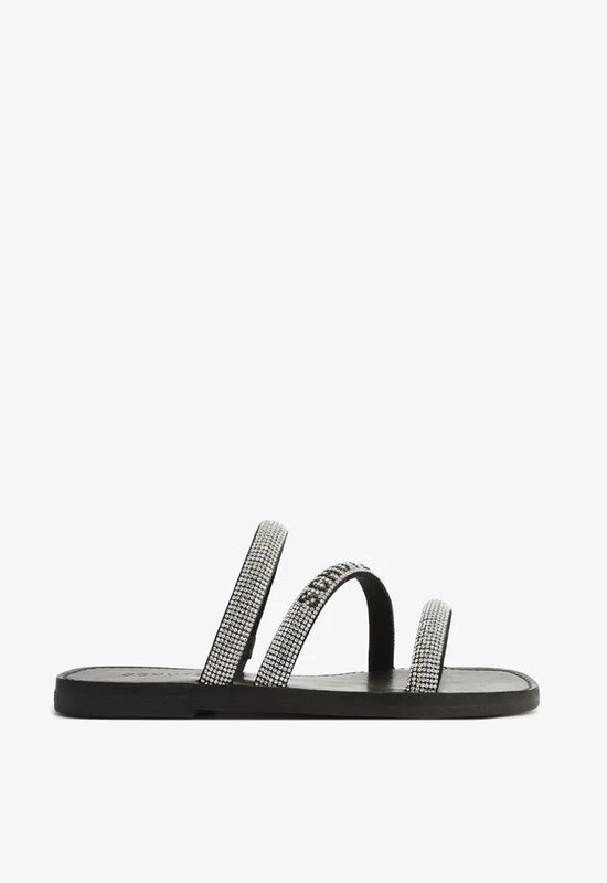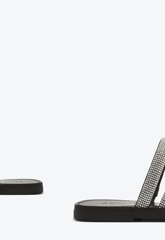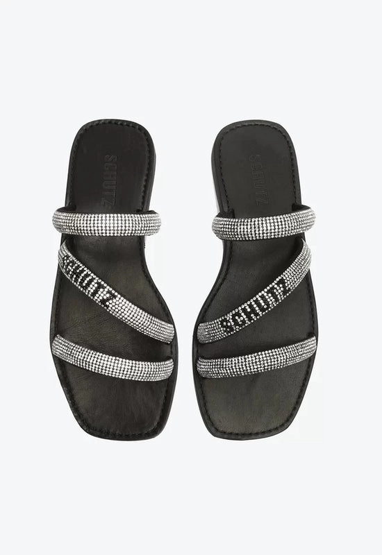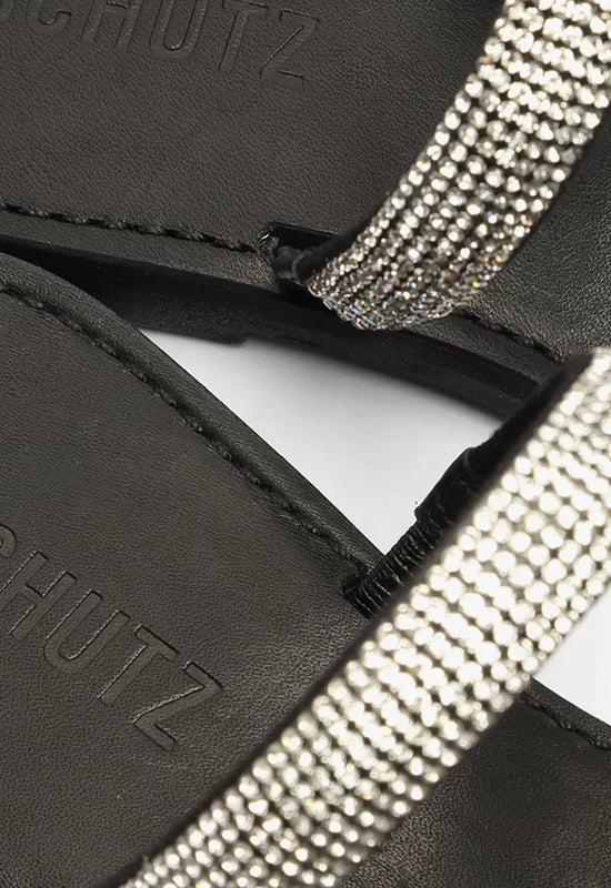 Sandália Rasteira Brilho Logo Preta e Prata Schutz
